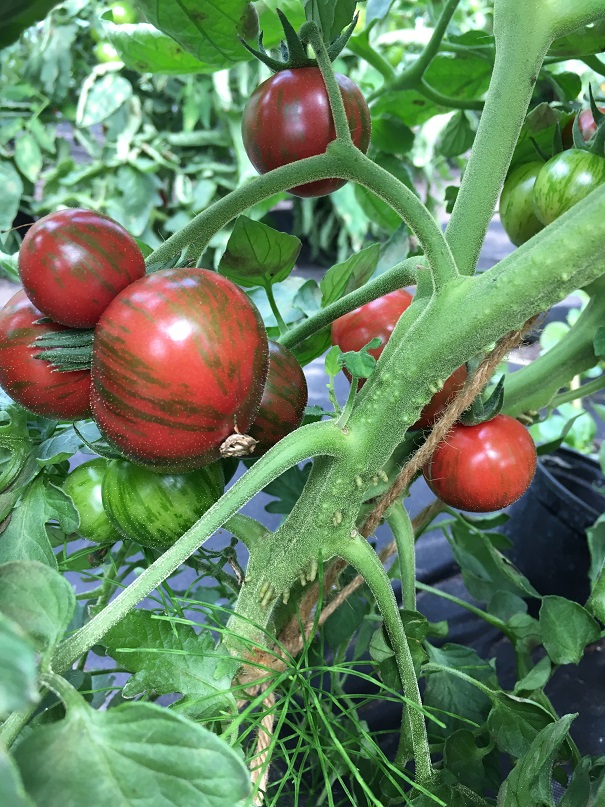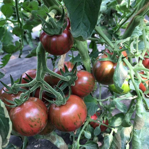 Viele kleine, feste, braunrote Früchte [20-30g] mit grünen Streifchen. Fruchtiges überzeugendes Aroma. Die ersten Früchte ab August, dann langes ertragreiches Erntefenster. Sorte ist wüchsig, geht bis 180cm. Dichter Wuchs, gezieltes Ausgeizen ist also sinnvoll.