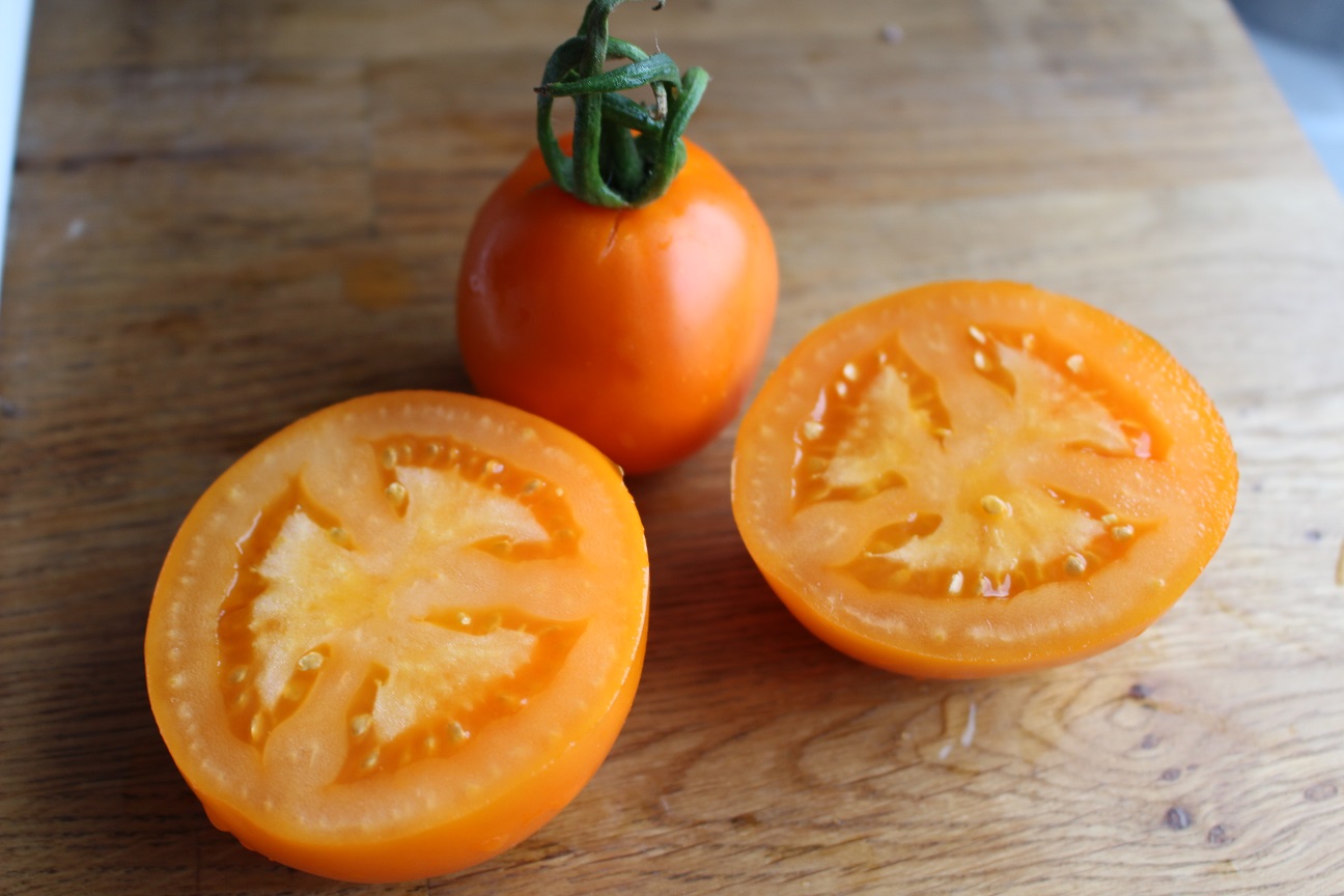 Die aus Nordamerika stammende Sorte Valencia gehört seit 2018 eindeutig zu unseren must-have-Tomaten. Die leuchtend orangefarbigen Früchte variieren in der Größe und wiegen dabei zwischen 50 bis 350 Gramm. Das in der Konsistenz sehr angenehme weiche Fruchtfleisch besticht durch einen ausgezeichneten fruchtig-spritzigen Geschmack und Saftigkeit. Ob frisch für Caprese, Salat oder eingekocht als Soße, die Valencia ist eine wahre Allrounderin in der Küche. Die Valencia erreicht bei uns 200cm Wuchshöhe und kann zweitriebig kultiviert werden.