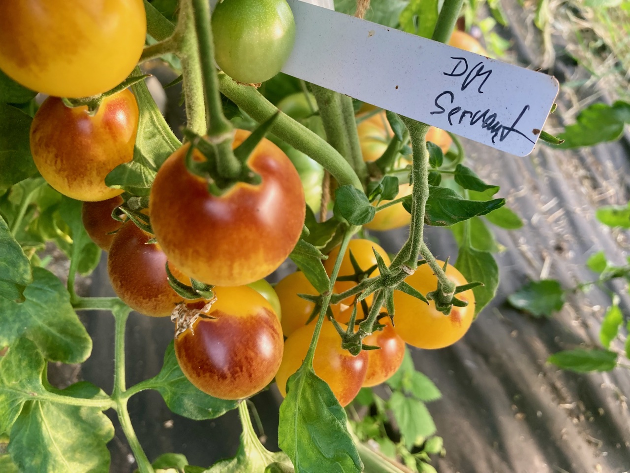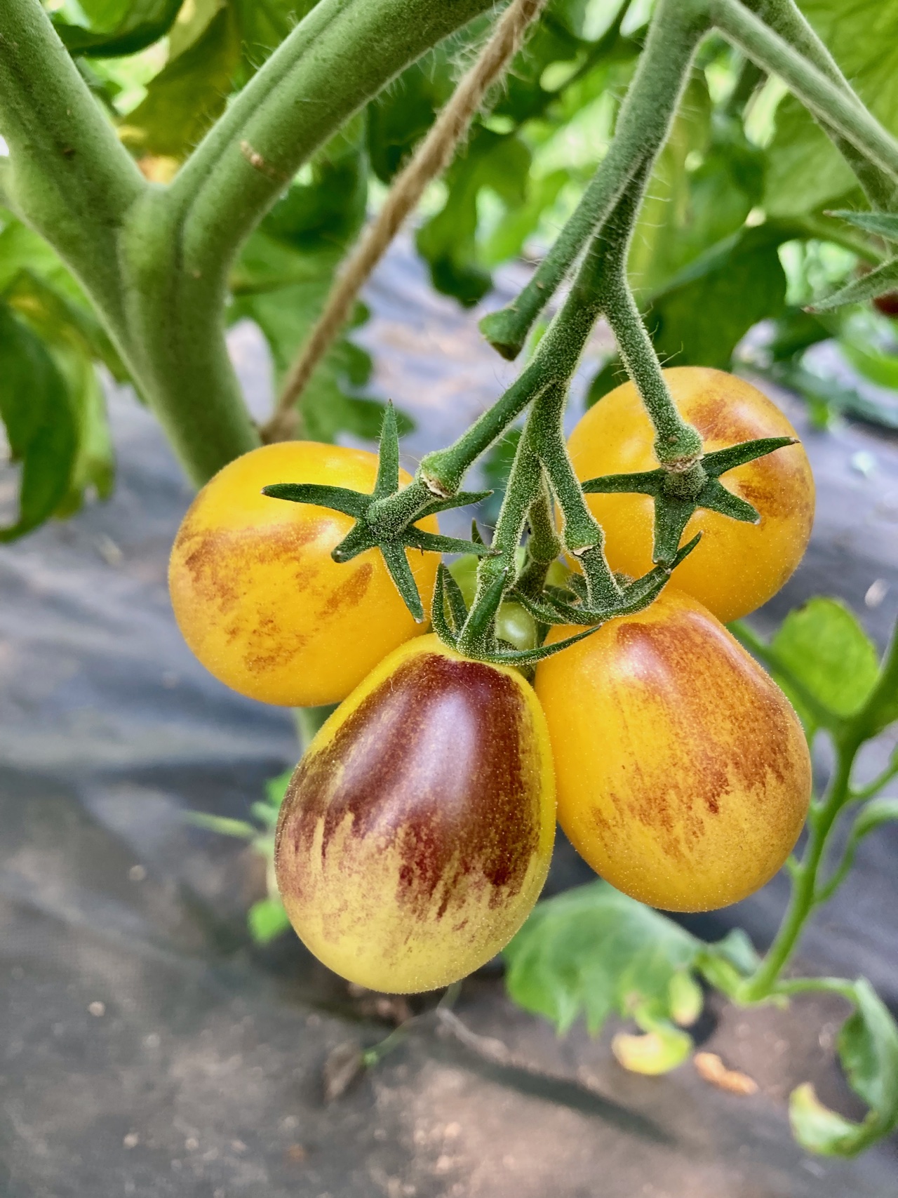 Eine äußertst produktive, oval bis birnenförmige, qietschgelb Kirschtomate mit violetten Schultern und spritzig süßem Geschmack. Gibt lange sehr gute Erträge. Wenig platzfreudig im Herbst.