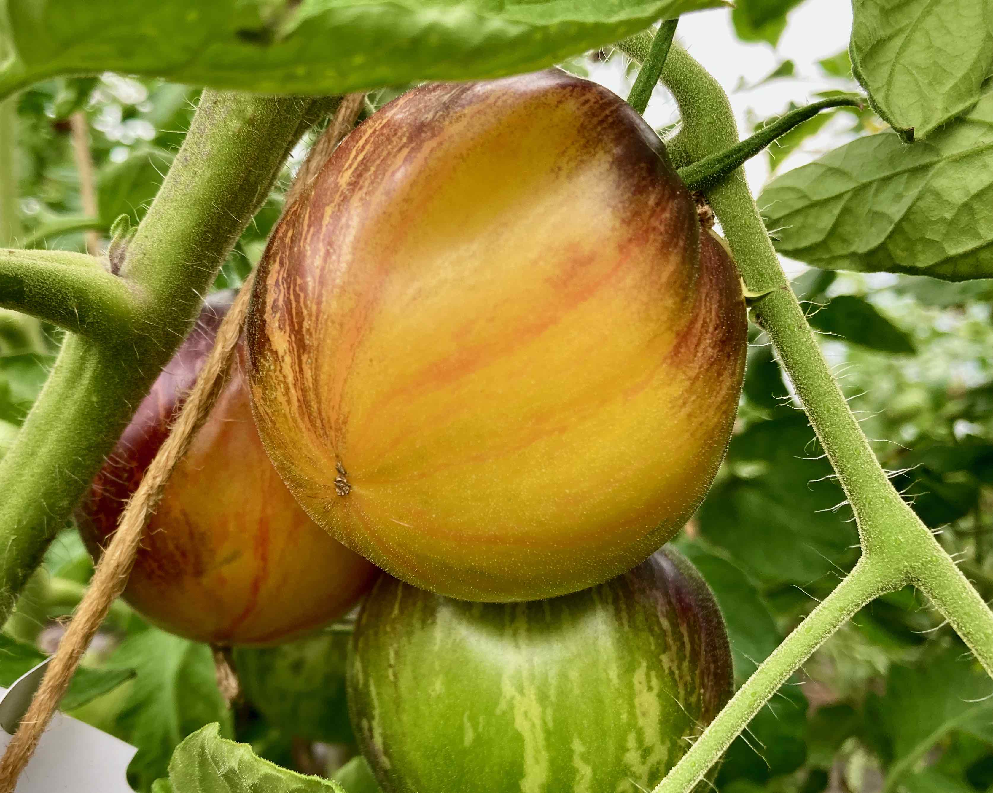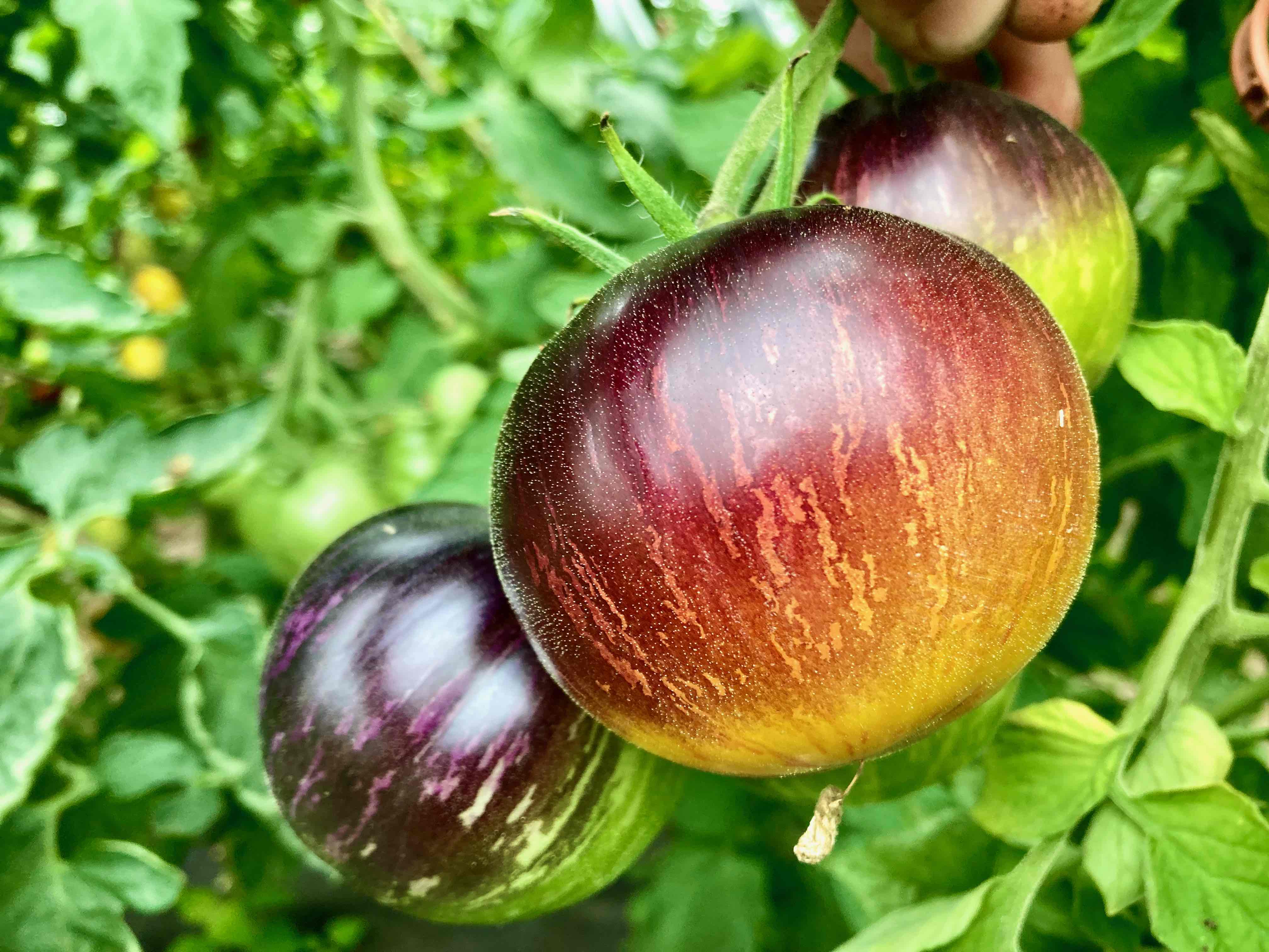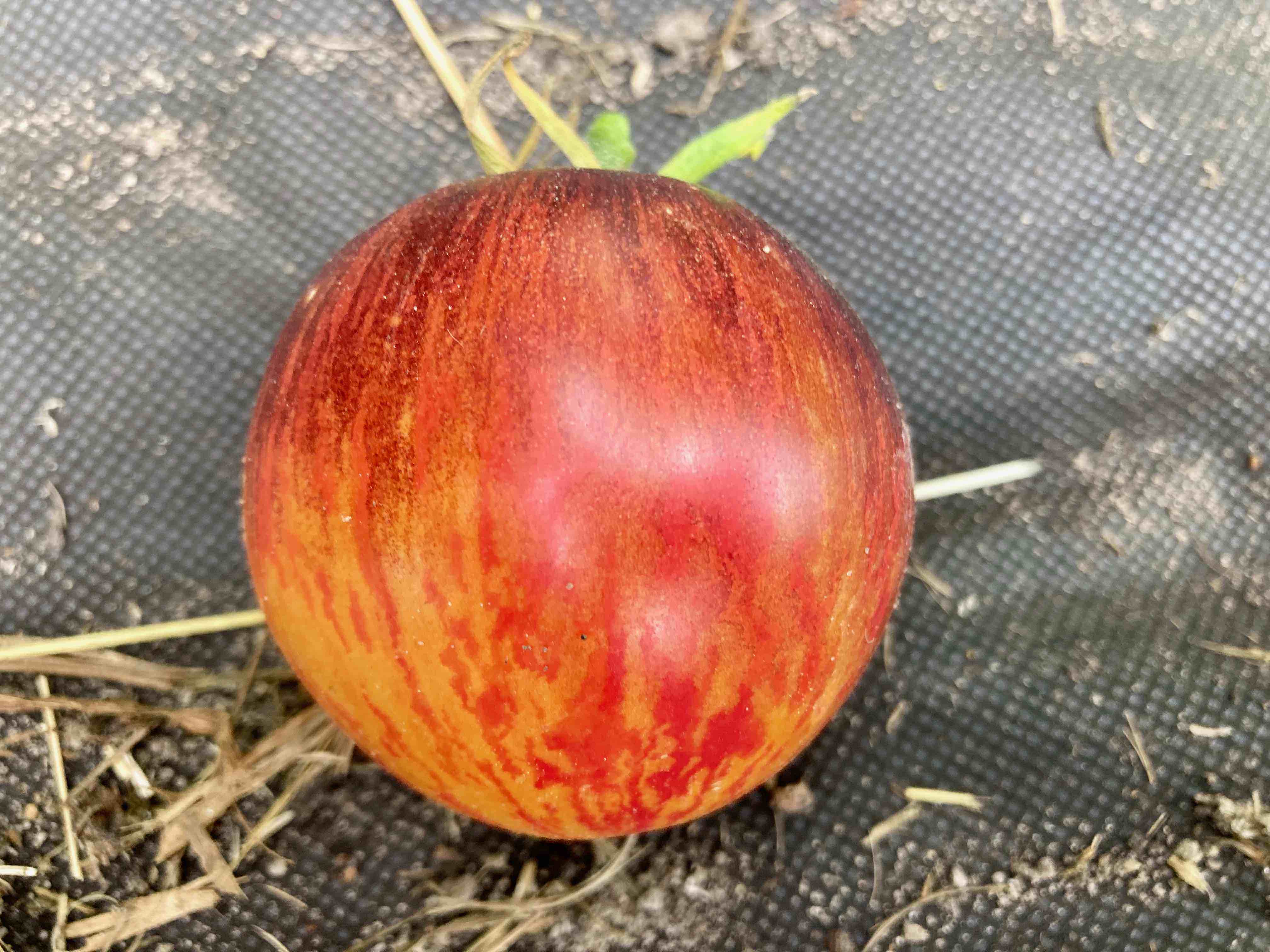 Sehr hübsch die Kleine. 60g Früchtchen kommen hier in super hübschem Dress. Ein Farbenspiel aus rosa rot orange gelb und lila in der Reife. Die Form variiert um oval bis rund.
