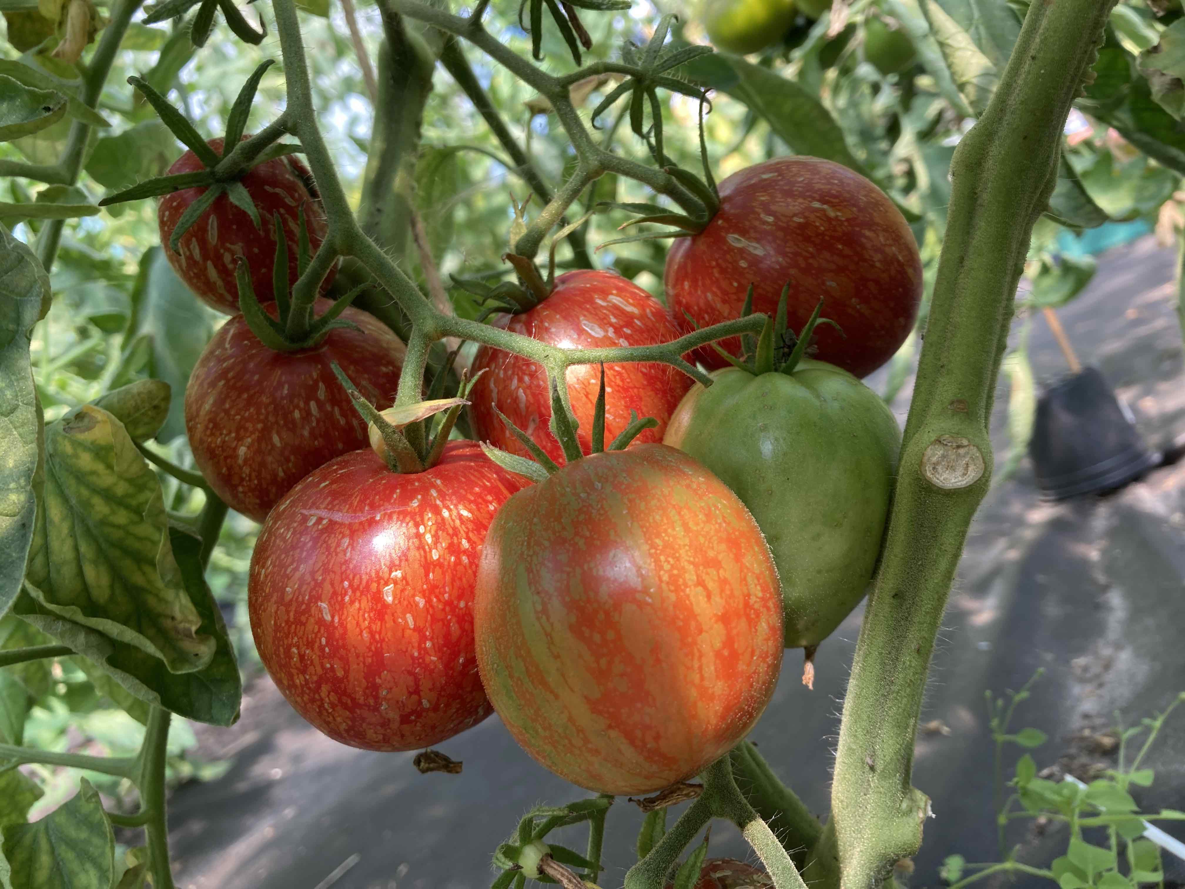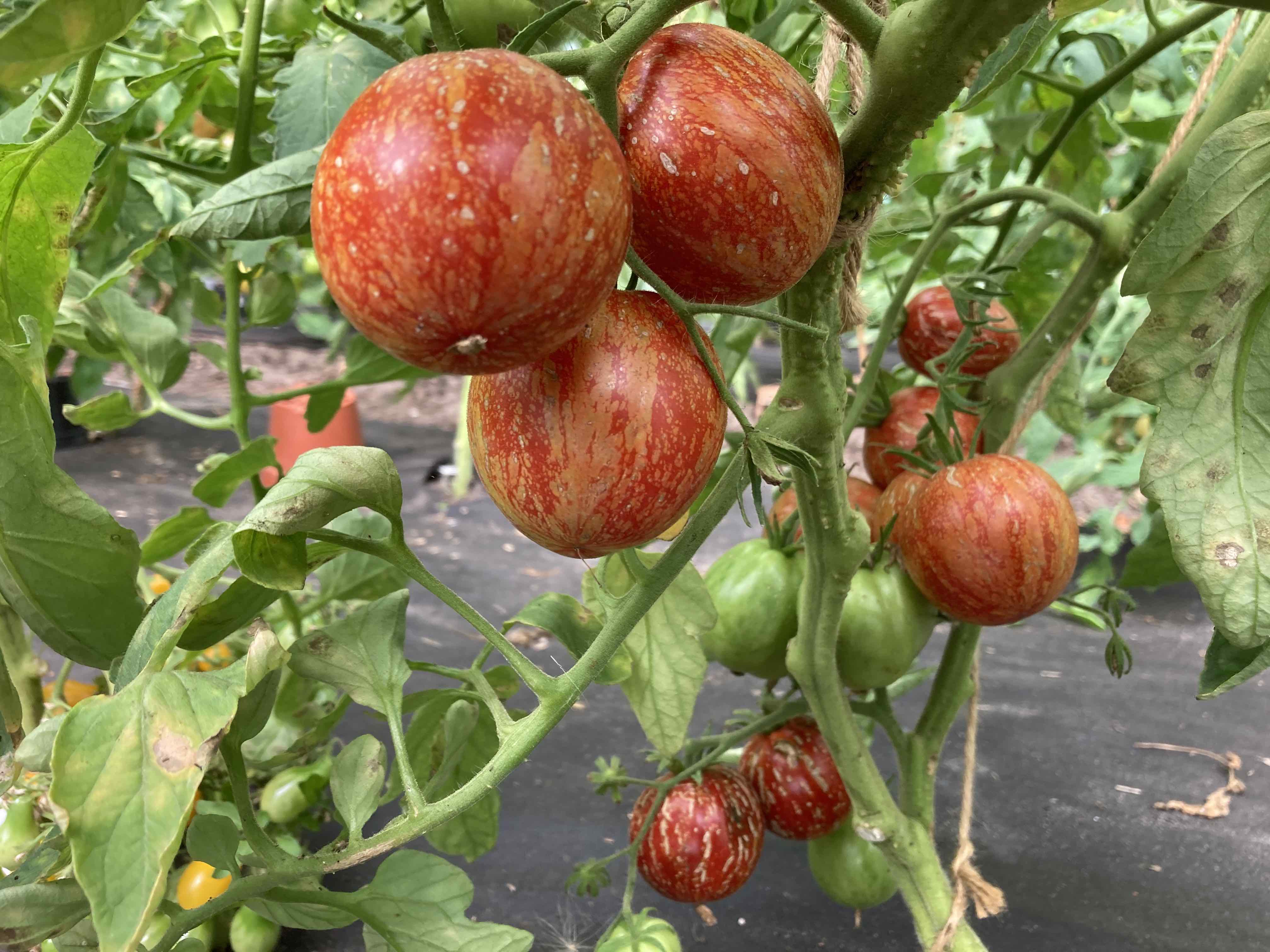 Die Frucht ist rund bis leicht oval, 5-7cm und wiegt 80 bis 100 Grammies. Scarface Rita wie wir sie gern nennen hat eine markant und auffällige Erscheinung. Mal Abgesehen von der Farbgestaltung hat diese Sorte eine eigenwillige Schale mit gelben Flecken und sortentypischen Narben. Der Name der Sorte leitet sich vermutlich vom englischen Wort „scab“ für Schorf ab. Sieht aus wie eine kleine Feuerwerk.