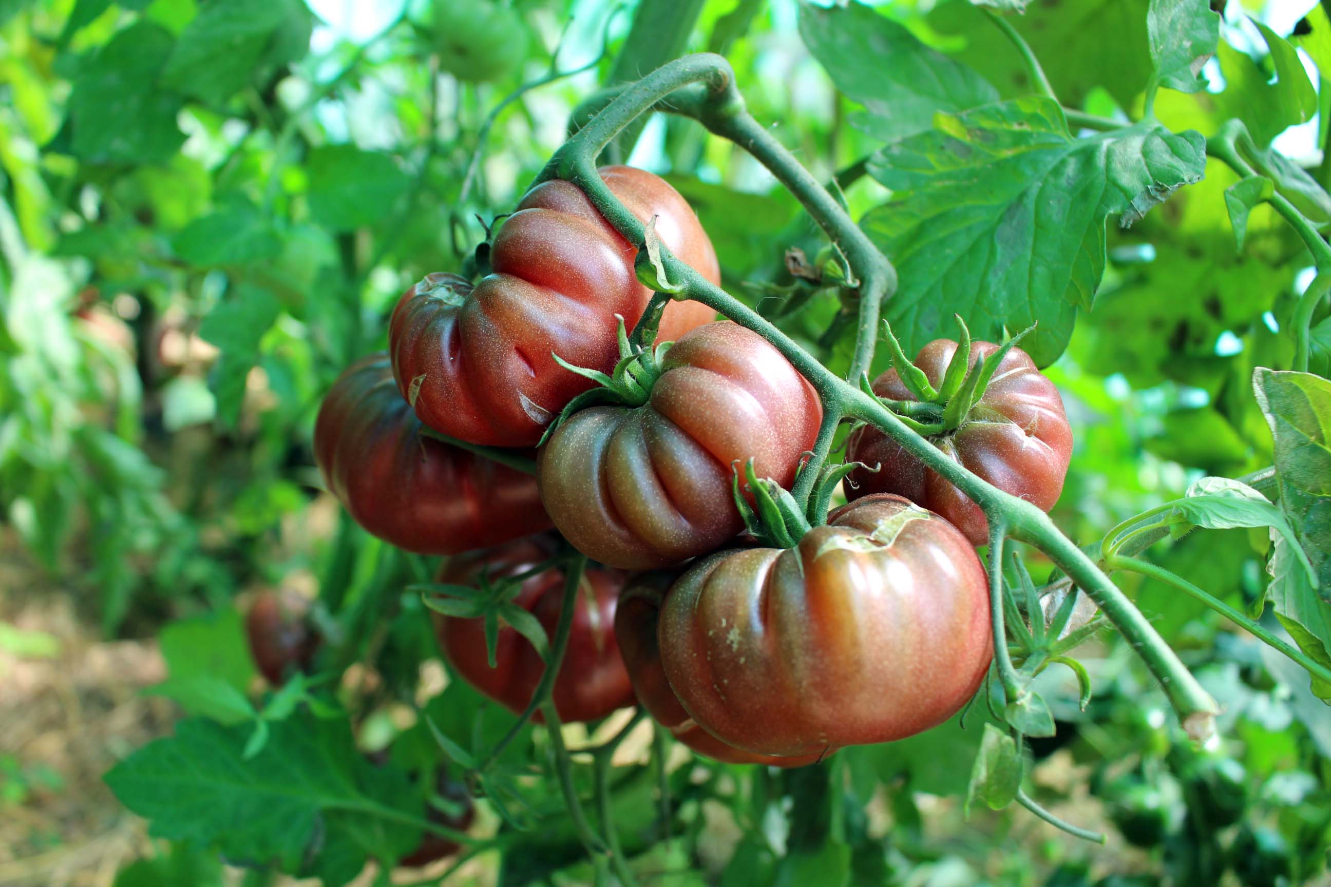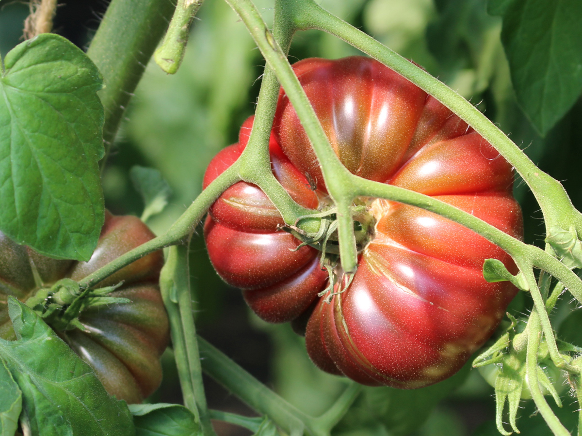 Je mehr Sonne diese historische Stabtomate bekommt, desto dunkler werden ihre platten, stark gefurchten, weinrot-lila-braunen Früchte. Im Geschmack sind sie besonders aromatisch, saftig-süß und ausgewogen. Das Gewicht der Früchte beträgt durchschnittlich 150 Gramm. Die vermutlich aus Indien stammende Purple Calabas verträgt mehrere Seitentriebe (wobei die Früchte dann kleiner bleiben) und verspricht eine ertragreiche Ernte von Ende Juli bis Ende September.