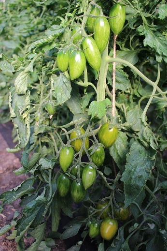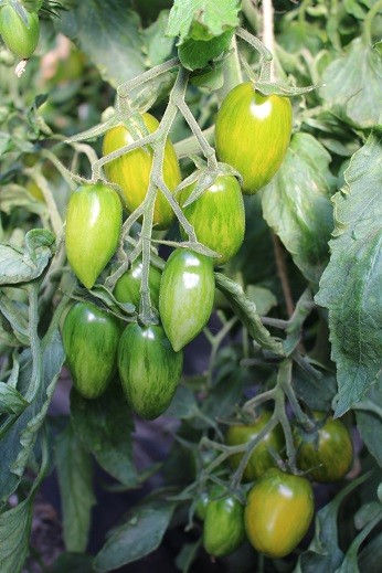 Eine wunderbare neue Cherrytomate vom californischen Züchter Fred Hempel, die im Netz erstmals 2013 Erwähnung fand. Das Profil der Pflanze ist recht schlank, sie ist wüchsig und verträgt gut 2-3 Stämme. Die Früchte der "Tiger"-Sorten von Fred Hempel sind schlank-oval und enden in einer kleine Spitze. Die unreifen Früchte sind grün-dunkelgrün gestreift, nehmen zur Reife hin typisch für grüne Sorten eine ockergelbe Grundfarbe an. Lässt man die Früchte dann noch etwas an der Pflanze, zeigen sie bald rötliche Streifen. Bei manchen Früchten wechselt sogar die Grundfärbung in ein tolles Rotbraun. Die ersten reifen Früchtchen [20-30g] gibt es ab Ende Juli und dann reichlich bis weit in den Herbst. Der Geschmack ist paradiesisch und vereint verschiedene Aromen: würzig, fruchtig, süß und vollmundig saftig. TOP-Tomate!